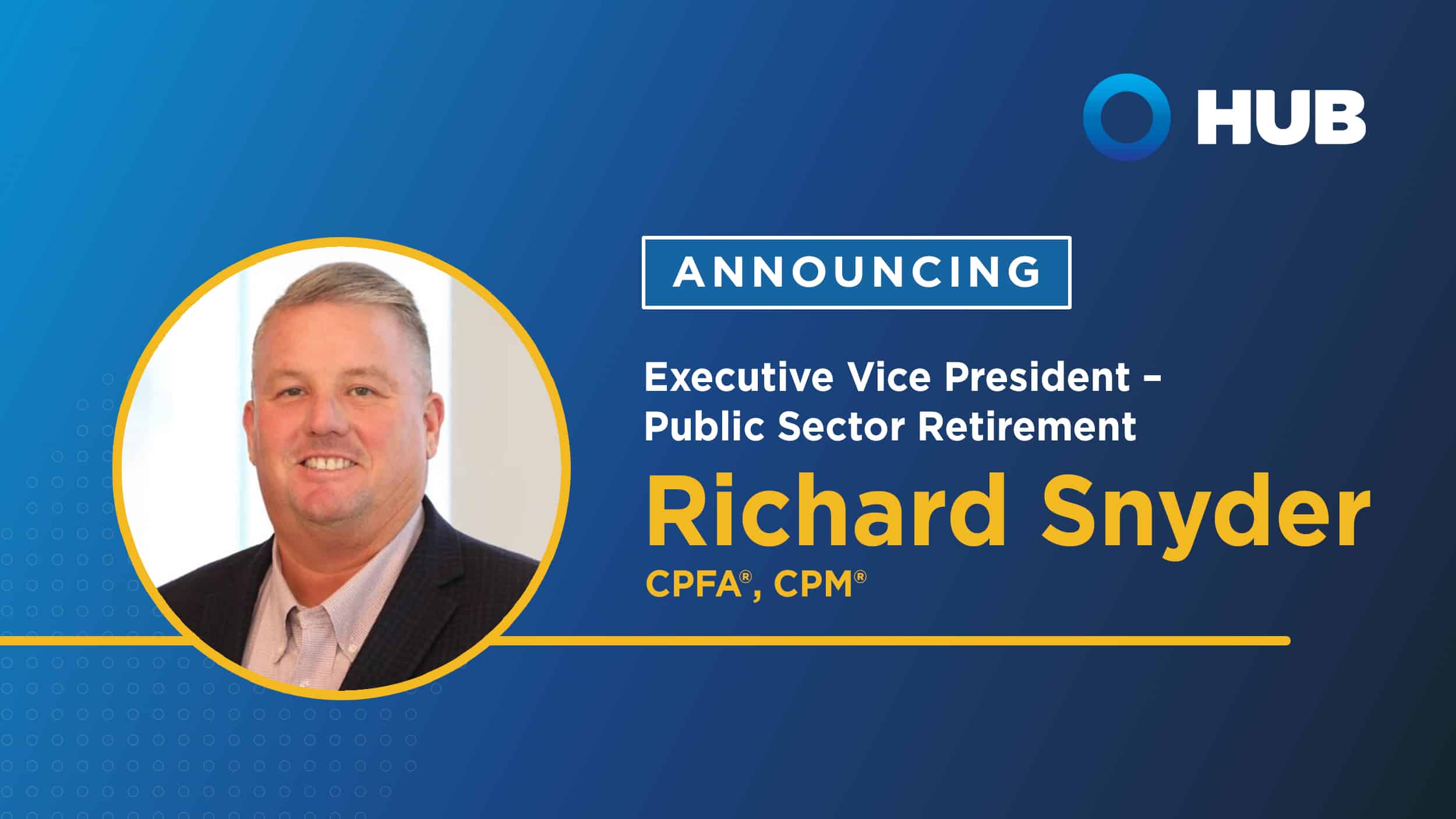 – HUB Retirement and Private Wealth (RPW), a division of HUB International, is pleased to announce that Richard J. Snyder, CPFA®, CPM® has joined the firm as Executive Vice President – Public Sector Retirement.