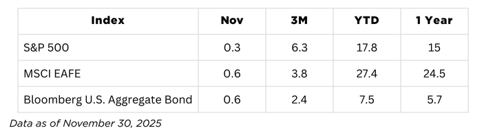 For fans of U.S. investment markets, November 2025 may appear to be a sequel to November 2024.  In that month, investors responded to the presidential election and anticipated changes in policies, balancing both positive and negative economic data points, all while looking at strong YTD stock market returns driven by a small group of stocks. This November, investors dealt with a closed and then reopened US government, limited economic data that delivered mixed indicators, and a healthy market driven by a small group of stocks. The month did bring a few plot twists, including shifting expectations of additional Fed rate cuts and growing questions about the durability of the AI theme that has carried markets to record highs again and again.  Investors watched market leader Nvidia fall 13%, while Alphabet (Google) rose 14% for the month and 50% for the trailing three months.  Additionally, value outperformed growth, small caps modestly outperformed large, and bonds beat stocks. In this sequel, the overlooked characters had a moment to outshine the bigger stars and add some depth to what has been a relatively narrow storyline for the last couple of years.
